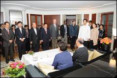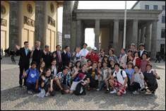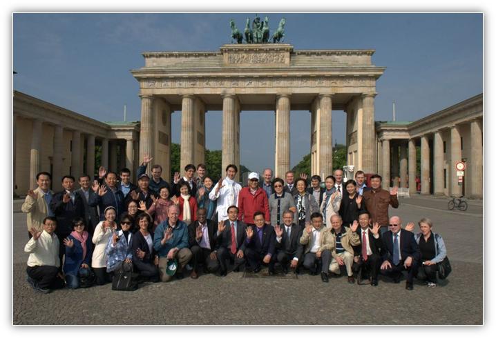 Although the weather had been cloudy for the previous two days, on Wednesday the sun was shining a warm welcome to True Parents as they left the hotel and walked directly to the Brandenburg Gate. This was the moment for which we had been waiting for so many years. True Father and the True Family walked through Brandenburg Gate, the symbol of the German unity and the end of the Cold War. In 1965 and 1981, True Father prayed for German unity on the western side of the Gate and now he could freely go through. We shouted cheers of mansei and took many pictures to capture this meaningful event. Just at this moment, an STF team came by and could take pictures with the True Family. It seemed to be heavenly planning.